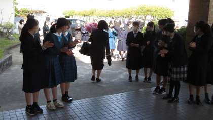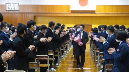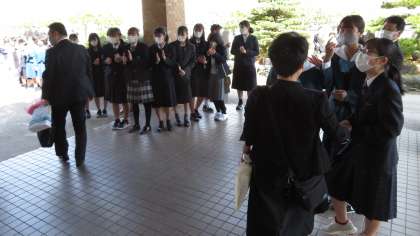 離任式 その2 公開日 2021/04/06 更新日 2021/04/06 今日の興南中 4月6日(火) 1限 2,3年生の花道を通ってお見送りをした(写真:上)あと、…… 正面玄関には、たくさんの卒業生が待っていました。(写真:中、下) 名残惜しいですね!