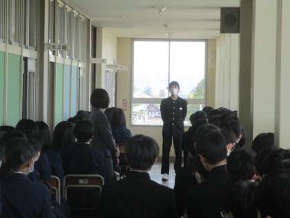 先頭の生徒が「最高学年としてふさわしい態度で着任式、始業式に臨み、下級生に示そう」と声をかけました。