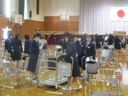 3年・入学式後片付け 公開日 2021/04/08 更新日 2021/04/08 3年生 4月8日(木) 11:20 入学式終了後、3年生が後片付けを行いました。 3年生にとってテキパキ集中、協力して短時間で作業を終えることは「当たり前」です。