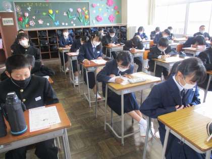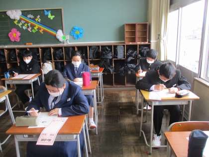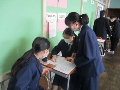 1年・学活 その1 公開日 2021/04/09 更新日 2021/04/09 1年生 4月9日(金) 3限 いよいよ中学校生活がスタートしました! 3限は自己紹介カードを書いたり、個人目標を書いたりしました。 クラスの仲間と楽しそうに話をしながら書いています。 (写真 上:1年1組 中:1年2組 下:1年3組)