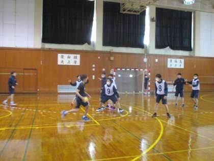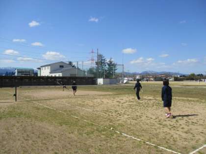 ソフトテニス部は、晴天の下、コートを全面使用してボレーの練習をしています。