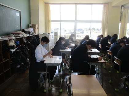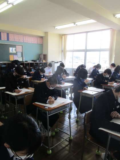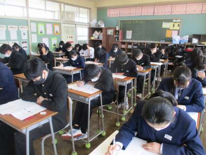 3年・中教研学力調査・1日目 公開日 2021/04/12 更新日 2021/04/12 3年生 4月12日(月) 3限 英語 3年生は、1〜3限、中教研学力調査を受けました。 (写真 上:3年1組 中:3年2組 下:3年3組) 明日は、社会、数学です!