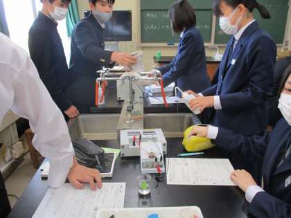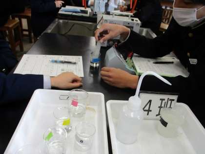 3年2組の理科は、科学室で、電流が流れる水溶液を調べる実験をしていました。