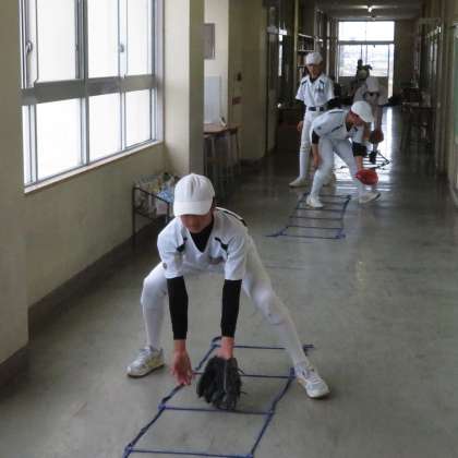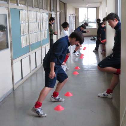 せっかくの休日練習の日ですが、野球部(写真:左)、サッカー部(写真:右)は3階廊下を中心にトレーニングをしていました。