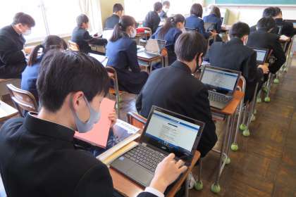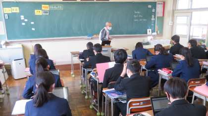 3年・英語・「クロームブックを活用して!!」 公開日 2021/04/20 更新日 2021/04/20 3年生 4月20日(火) 1限 3年3組の英語は、クロームブックを活用して、英文の音読をしています。 自分のペースで進めることができます!!