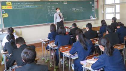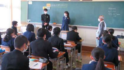 (写真 上:3年1組の英語の授業)