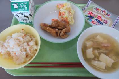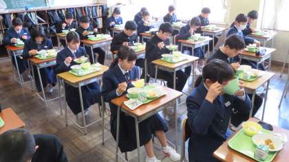 入学&進級・お祝い給食 公開日 2021/04/21 更新日 2021/04/21 今日の興南中 4月21日(水) 給食 今日の献立は、「ちらし寿司・牛乳・鶏肉の米粉揚げ・ポテトサラダ・すまし汁・お祝いデザート(クレープ)」です。(写真:上) 1年生も少しずつ興南中の給食システムになれ、たくさんおかわりして、モリモリ食べています。 (写真 中:1年2組のようす 下:1年3組のようす)