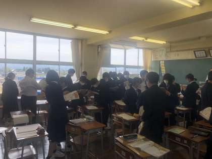 2年2組の社会は、生徒が自由に席を動き、お互いに学び合っています。