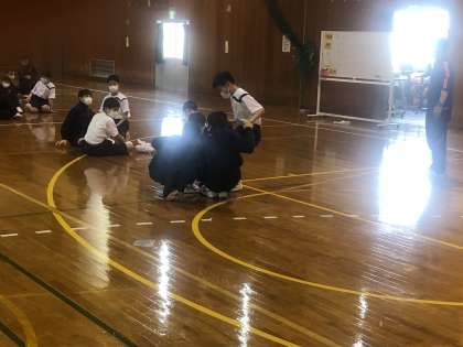 1年3組の体育は、グループで協力して全員で立ち上がろうとしています。