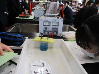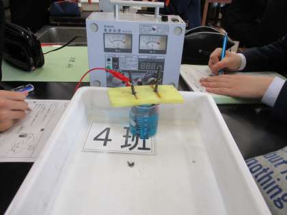 3年1組の理科は、塩化銅水溶液の電気分解の実験をしました。