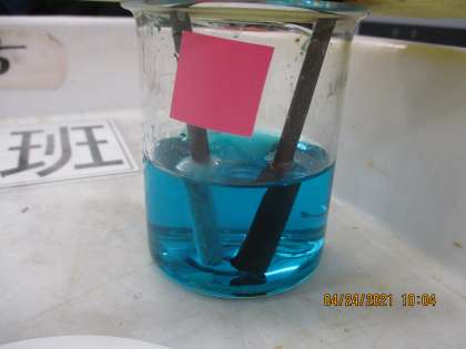 電流を流すと、陽極から気体が出ていました。(写真:上)