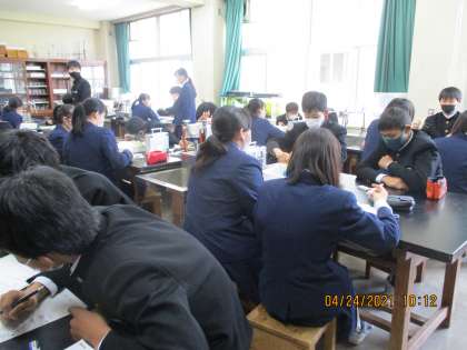 3年3組の理科は科学室で、塩化銅水溶液の電気分解の実験をしました。