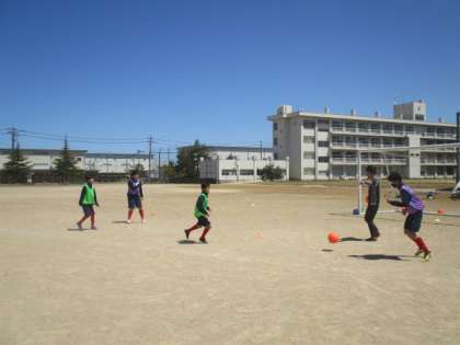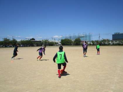 サッカー部は、グラウンドでポゼッション練習をしています。