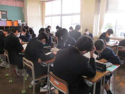3年・授業風景 公開日 2021/04/28 更新日 2021/04/28 3年生 4月28日(水) 3限 3年生の授業はいつも意欲的です。 (写真 上:3年1組 国語 論語の朗読) (写真 中:3年2組 英語 現在完了形の学習) (写真 下:3年3組 保体 短距離のスタート時の歩数の確認)
