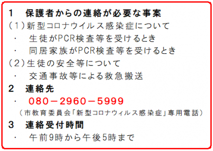 学校が閉庁しますので、保護者から学校に連絡が必要となるような緊急の事案が発生した場合には、市教育委員会「新型コロナウィルス感染症」専用電話に連絡いただくようお願いします。