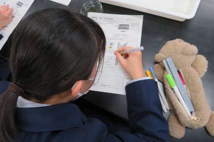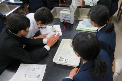 3年・理科・酸性とアルカリ性の正体 公開日 2021/05/07 更新日 2021/05/07 3年生 5月7日(金) 4限 3年2組の理科は、科学室で、酸性とアルカリ性の水溶液に電圧をかけて実験しました。(写真:中) BTB溶液の色の変化から、考えを深めています。 (写真 下:ペンで色分けしながら、イオンの動きを考察しています。)