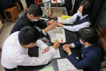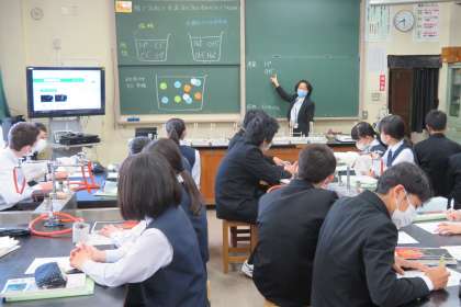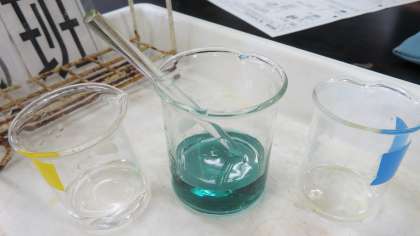 3年2組の理科は、科学室で、「酸(薄い塩酸)とアルカリ(水酸化ナトリウム水溶液)を混ぜ合わせたときの反応」の実験を行いました。