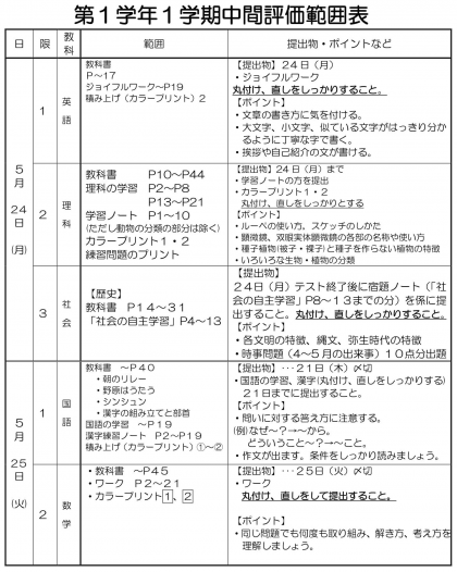 今日、「中間評価・範囲表」を配布しました。