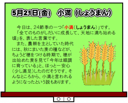 今日は「小満(しょうまん)」です! 公開日 2021/05/21 更新日 2021/05/21 今日の興南中 5月21日(金) 8:00 気温は19度、天気は雨、梅雨空が広がっています。 今日は、24節気の一つ「小満(しょうまん)」です。
