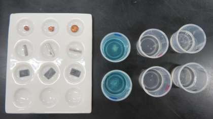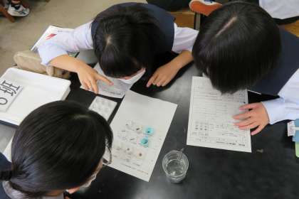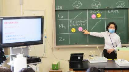 3年・理科・イオン化傾向 公開日 2021/05/25 更新日 2021/05/25 3年生 5月25日(火) 3限 3年2組の理科は科学室で、金属のイオンへのなりやすさを比較する調べる実験を行いました。 Cu、Mg、Znの3つの金属について調べました。(写真:上、中) 実験結果から、陽イオンへのなりやすさを考察するのですが、これがなかなか難しい!(写真:下)