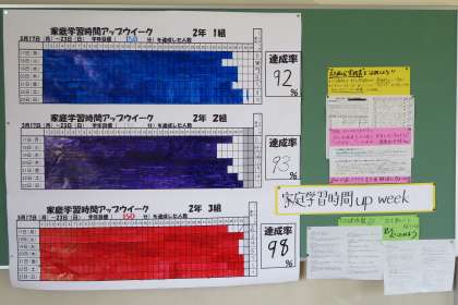 2年・中間評価を振り返ると…… 公開日 2021/05/26 更新日 2021/05/26 2年生 5月26日(水) 西階段掲示板に「家庭学習時間UP WEEK」のグラフがあります。 グラフを見ると、一目瞭然! どのクラスも達成度がすごく高いことが分かります。 今日から、テストがどんどん返却されています。 家庭学習時間とテストの結果はどのような関係が……?