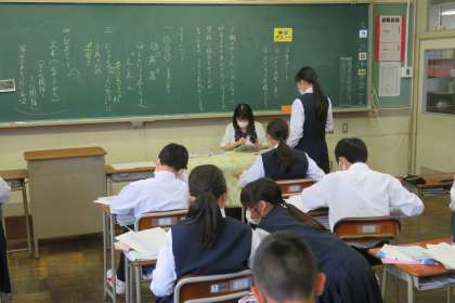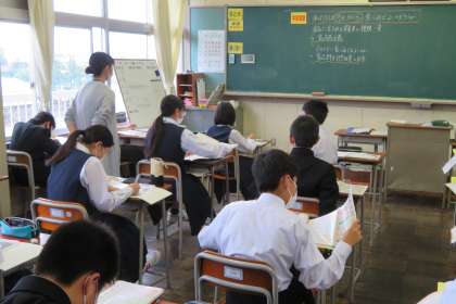 1年・授業風景・その2 公開日 2021/05/27 更新日 2021/05/27 1年生 5月27日(木) 5限 給食でおいしいかしわうどんを食べたので、午後の授業もモリモリ頑張っています! (写真 上:1年1組 数学の授業) (写真 中:1年2組 家庭科の授業) (写真 下:1年3組 国語の授業 中間評価の見直し)