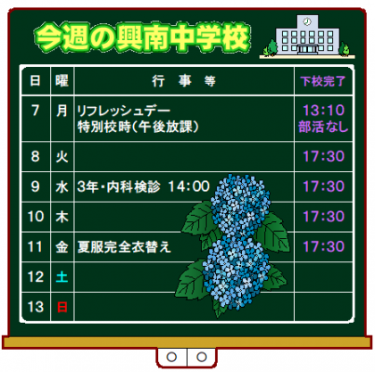 明日7日(月)は、先生方の研修会のため、特別校時で運行します。