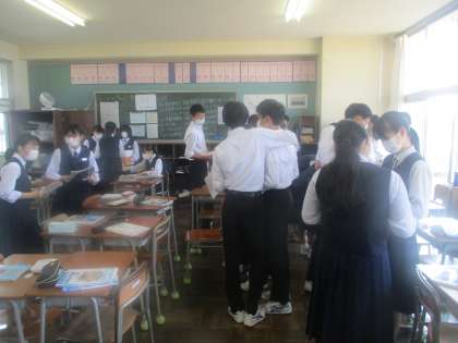 1年前の臨時休業期間中に世界や日本で起きていた出来事についてペアで確認したあと、クラスで互いの考えを深め合いました。(写真)