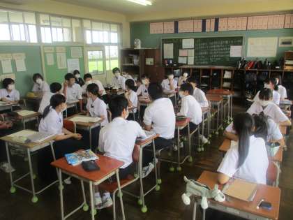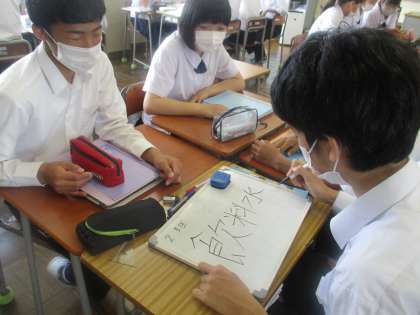 3年生は、公民の民主主義の学習の導入として「学級全体で、無人島に1つだけ持って行くものを決める」活動をしました。