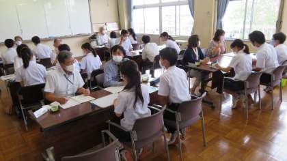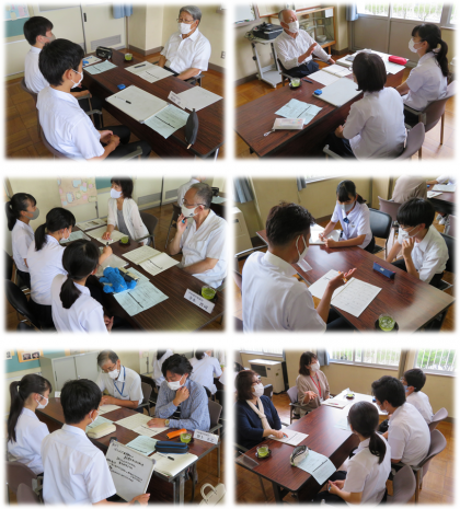 「第2回 学校運営協議会」は、委員と生徒会執行部14名で「これからの興南中を語り合う会」を行いました。(写真:上)
