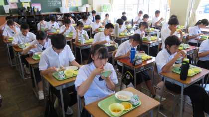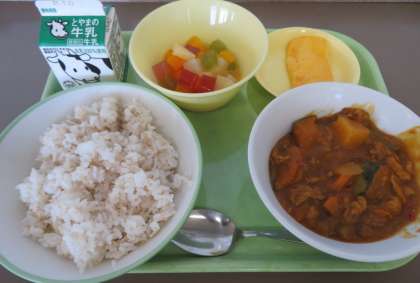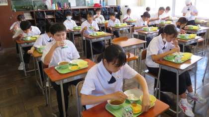 夏野菜カレーで、暑さを吹き飛ばせ! 公開日 2021/07/16 更新日 2021/07/16 今日の興南中 7月16日(金) 給食 今日の献立は、「夏野菜カレー・麦ごはん・牛乳・卵ロール・フルーツカクテル」です。(写真:上) こんな夏本番の暑さには、夏野菜カレーがピッタリです! (写真 中:1年1組のようす 下:2年1組のようす)