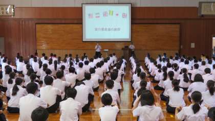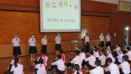 体育大会・結団式・その1 公開日 2021/07/19 更新日 2021/07/19 今日の興南中 7月19日(月) 1限 全校生徒が体育館に集まり、体育大会・結団式を行いました。 (写真 上:実行委員長の挨拶 下:実行委員の紹介)