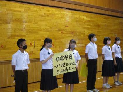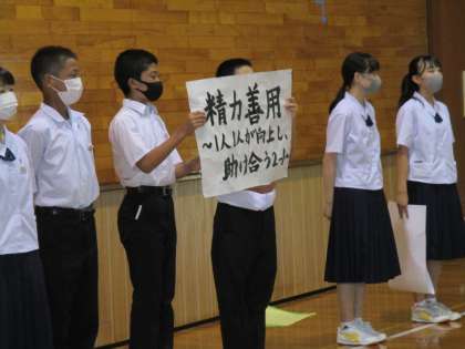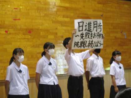 2年・学年集会・その1 公開日 2021/07/20 更新日 2021/07/20 2年生 7月20日(火) 2限 学年生徒会主催の学年集会を行いました。 学年目標、各学級目標、学習、生活について振り返りました。 (写真 上:学年目標を達成するために「挑戦」したことを発表) (写真 中:2年1組 学級目標に対して達成したことを発表) (写真 下:2年2組 来学期に向けての決意を発表)