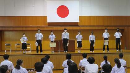 7月21日(水) 9:00 全校生徒が体育館に集まり、まず「受賞報告会」を行いました。