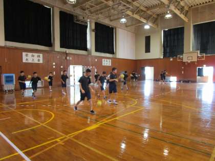 8月3日(火) 9::00 ハンドボール部は、ウォーミングアップでドリブル練習をしています。