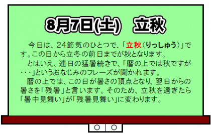 暦のうえでは、「立秋」から秋に入るため、「今日は立秋。暦のうえでは秋となりました」、「立秋を迎え、秋となりましたが……」などのフレーズがテレビで使われています。