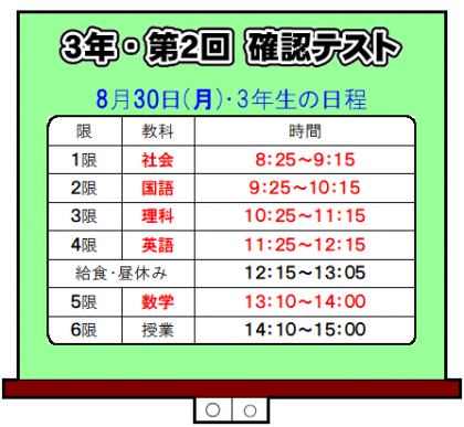 そこで、この日に予定していた「第2回 確認テスト」は、8月30日(月)に変更します。(日程は下記のとおりです。)