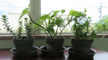 (写真:左から、クラッスラ、ポトス、ハートヘデラ)
