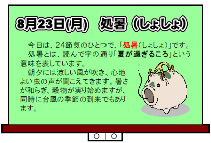 今日は、「処暑(しょしょ)」です! 公開日 2021/08/23 更新日 2021/08/23 今日の興南中 8月23日(月) 17:30 夏休み33日目、夏休み最後の週になりました。 今日は、24節気のひとつ、「処暑(しょしょ)」です。 暦の上では、この時期からはだんだんと暑さがおさまる頃と言われているのですが、実際はどうなのでしょうか?