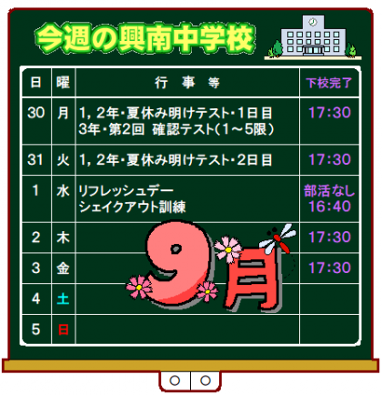 1,2年生は、明日、明後日、「夏休み明けテスト」です。