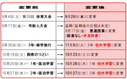 また、体育大会以外にも、「市新人大会」、「3年・修学旅行」、「興南のつどい」、「1年・宿泊学習」、「2年・宿泊学習」の日程等も変更します。(下記参照)
