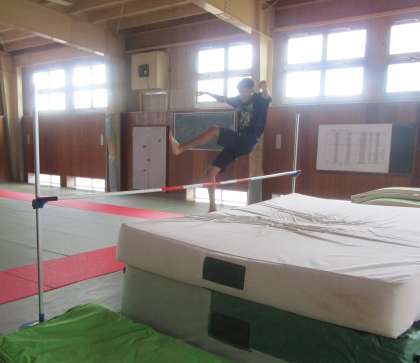 (写真 上:走高跳の練習 下:手押し車トレーニング)