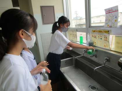 9月7日(火) 16:50 保健実践部が、手洗い場で、洗浄液の補充をしています。