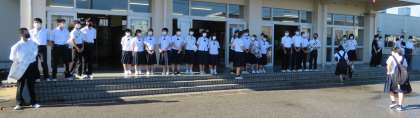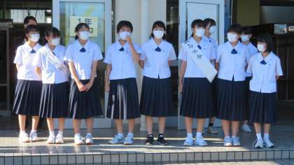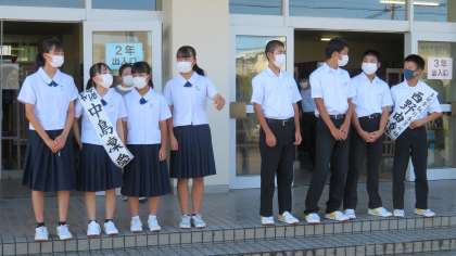 選挙運動・「よろしくお願いしま〜す!!」 公開日 2021/09/09 更新日 2021/09/09 今日の興南中 9月9日(木) 7:50 気温は25度、天気は晴れ。 天気が回復し、カラッとした暑さになりそうです。 生徒玄関前では、選挙運動が展開されています!(写真) 立候補者の元気な声が響いています! 週明け13日(月)が、生徒会役員選挙です!