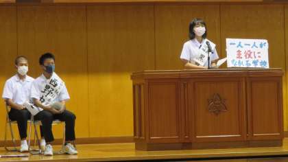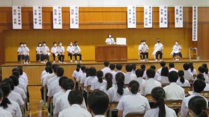 生徒会役員選挙の立会演説会を体育館で行いました。(写真)