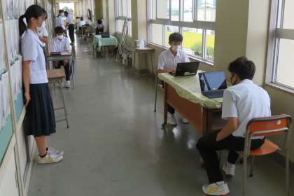 生徒会役員選挙・投票 公開日 2021/09/13 更新日 2021/09/13 今日の興南中 9月13日(月) 6限 選挙管理委員会の立ち会いの下、教室前廊下のクロムブックで投票しました。 クロムブックの活用方法がまたひとつ広がりましたね!