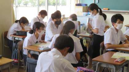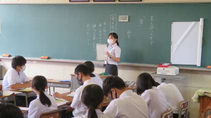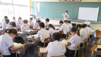 教育実習生・道徳研究授業・その1 公開日 2021/09/15 更新日 2021/09/15 今日の興南中 9月15日(水) 1限 教育実習生は、4人とも道徳の研究授業を行いました。 教育実習生・岡本先生は、2年3組で資料「愛」を使って授業を展開し、ともに助け合い、協力し合って生きていこうとする心情に迫りました。