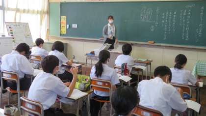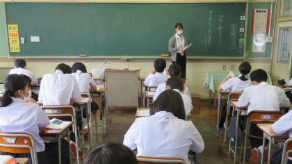 教育実習生・河上先生は、1年3組で資料「風を感じて 村上清加のチャレンジ」を使って授業を展開し、前向きに挑戦し続けようとすることの大切さを考えました。