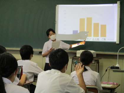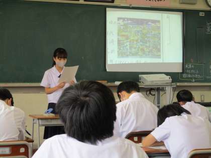 1年・総合・クラス発表 公開日 2021/09/17 更新日 2021/09/17 1年生 9月17日(金) 5限 1年生は、総合的な学習の時間に夏休みに現地に行って取材した写真等を持ち寄り、富山の「本気」、素晴らしいところを発表しました。 画像あり、グラフあり、クイズありの「本気の発表」もあり、見応えがありました。 (写真 上:1年1組の発表の様子) (写真 中:1年2組の発表の様子) (写真 下:1年3組の発表の様子)