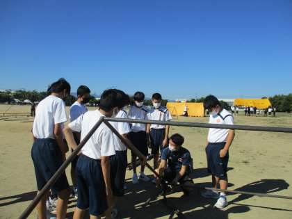 2年・体育大会準備 公開日 2021/09/21 更新日 2021/09/21 2年生 9月21日(火) 1限 2年生は、来週に行われる体育大会に向けて、本部テントの設営やグラウンドの整備を行いました。 (写真 上:草むしりの様子) (写真 中:倉庫からテントの用具を運んでいます) (写真 下:テントの設営)